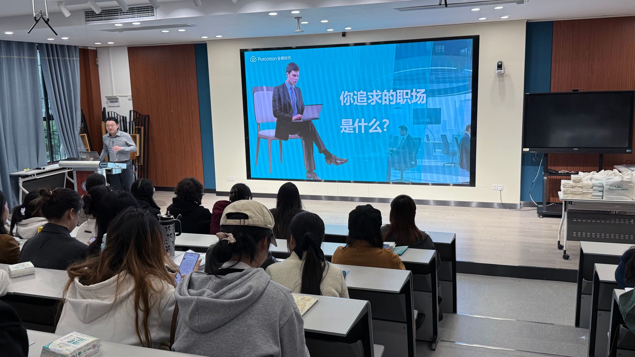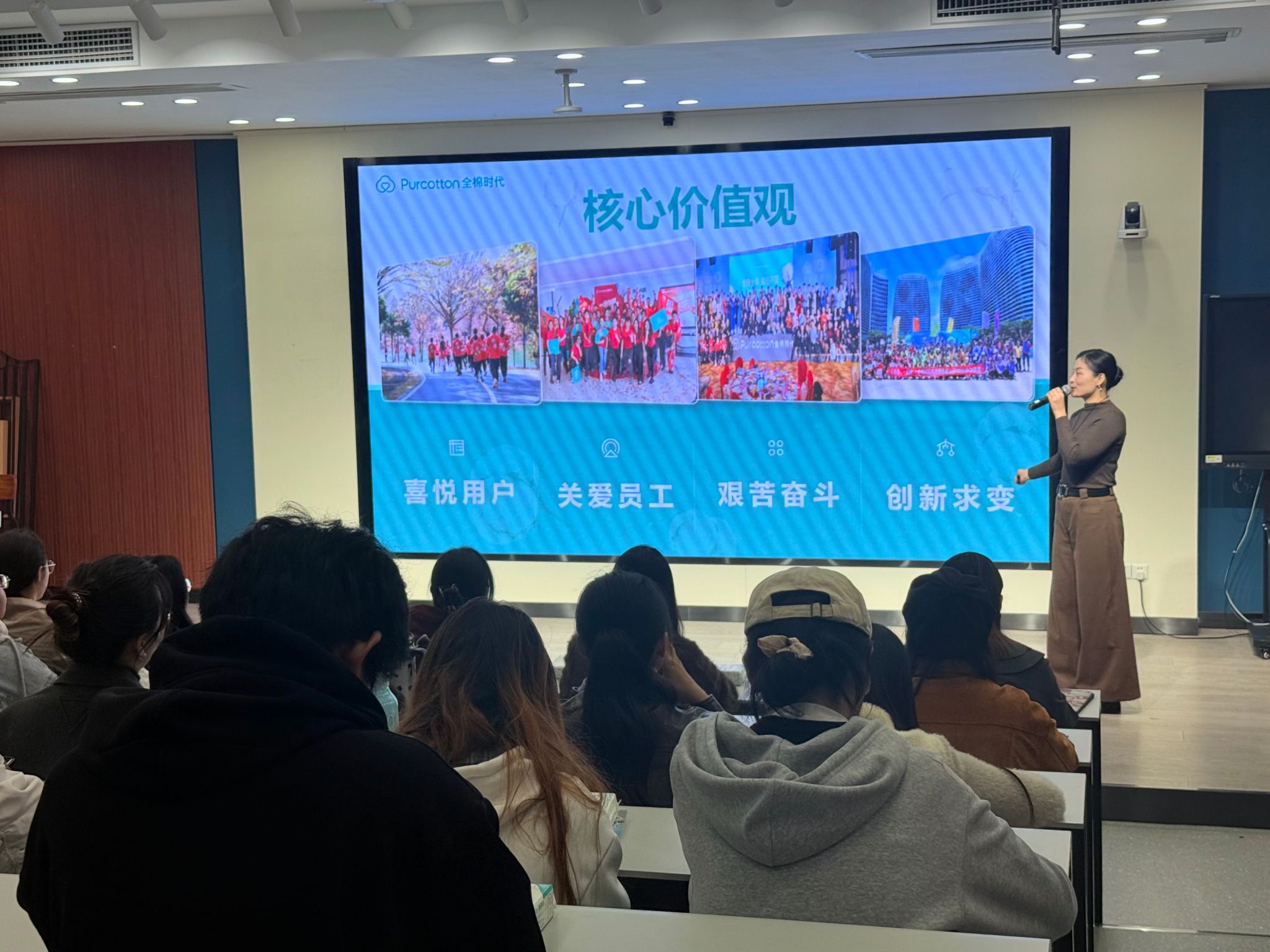 为促进2026届毕业生高质量充分就业,10月20日,国内知名企业全棉时代公司专场招聘宣讲会在A12-105教室圆满举行。全棉时代招聘负责人牟鑫、HRBP经理辛胜男、视觉设计经理邹永胜、曾任聪,以及培训发展部主管潘睿亲临现场,辅导员李天和有意愿的毕业生参加会议。