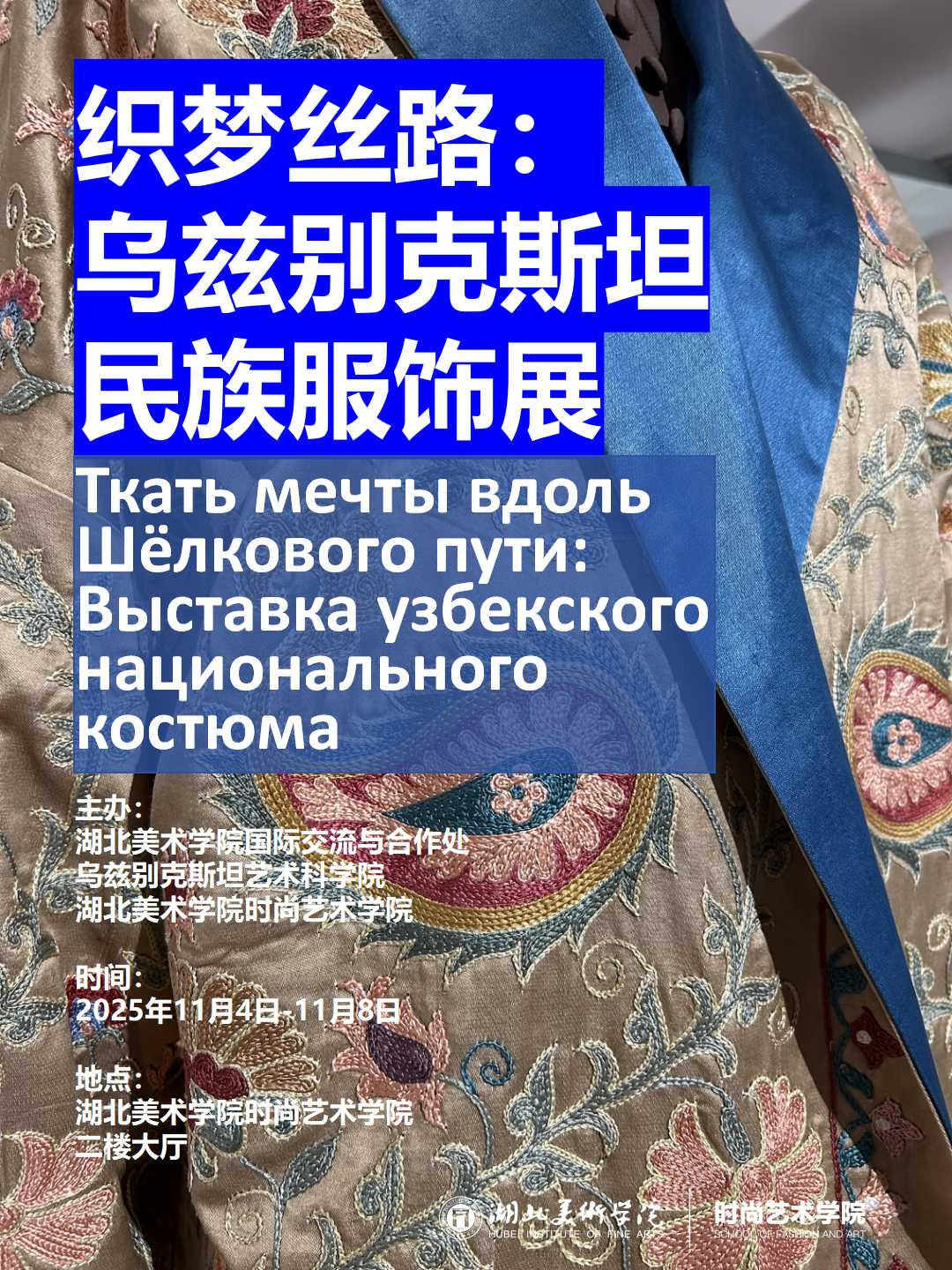 2025年11月4日至9日,乌兹别克斯坦艺术科学院代表团一行访问湖北美术学院,并举办“织梦丝路:乌兹别克斯坦民族服饰艺术展”。本次展览由湖北美术学院国际交流与合作处、乌兹别克斯坦艺术科学院及时尚艺术学院联合主办,旨在通过服饰文化与学术对话,深化两国在艺术教育与文化研究领域的相互合作。