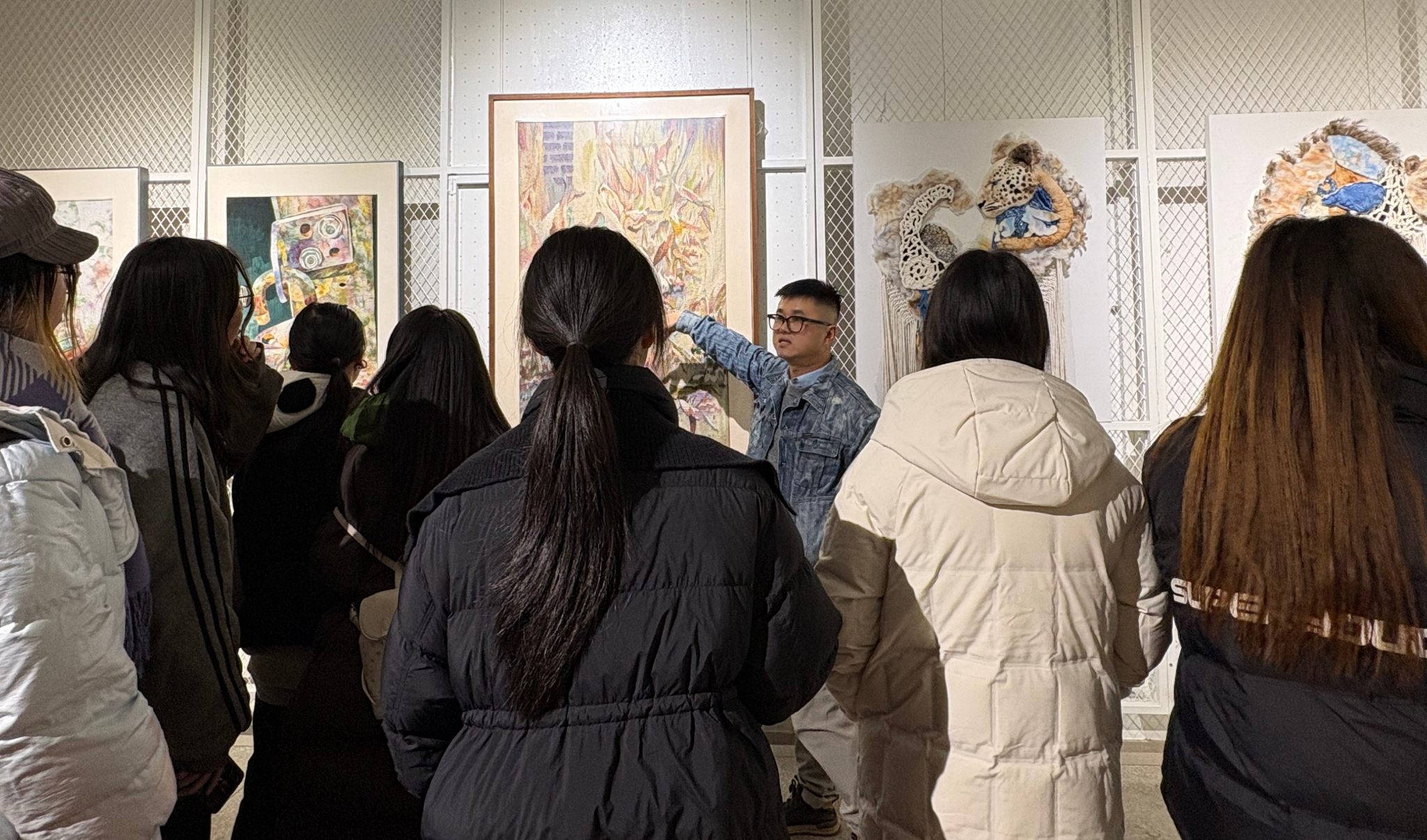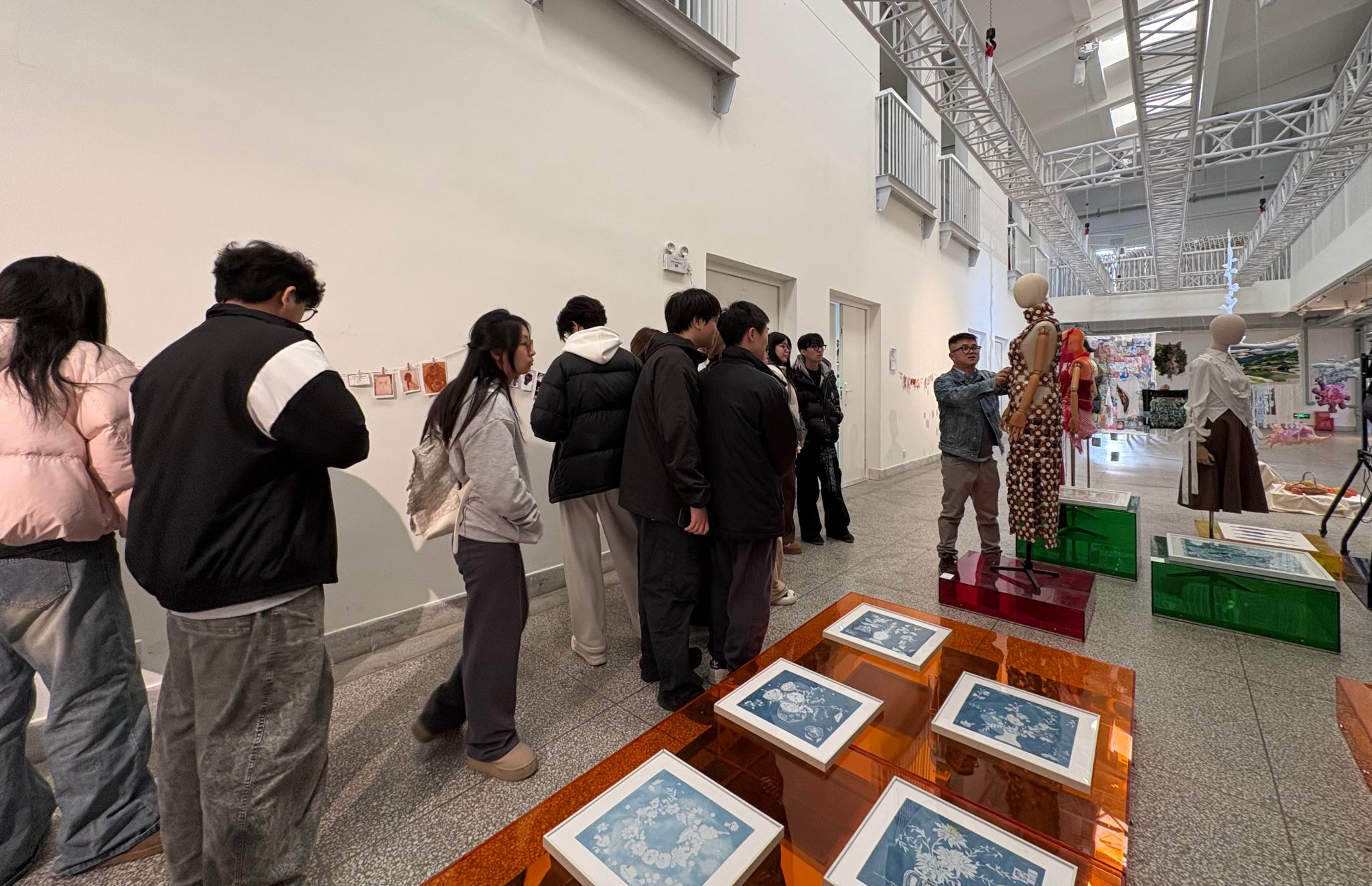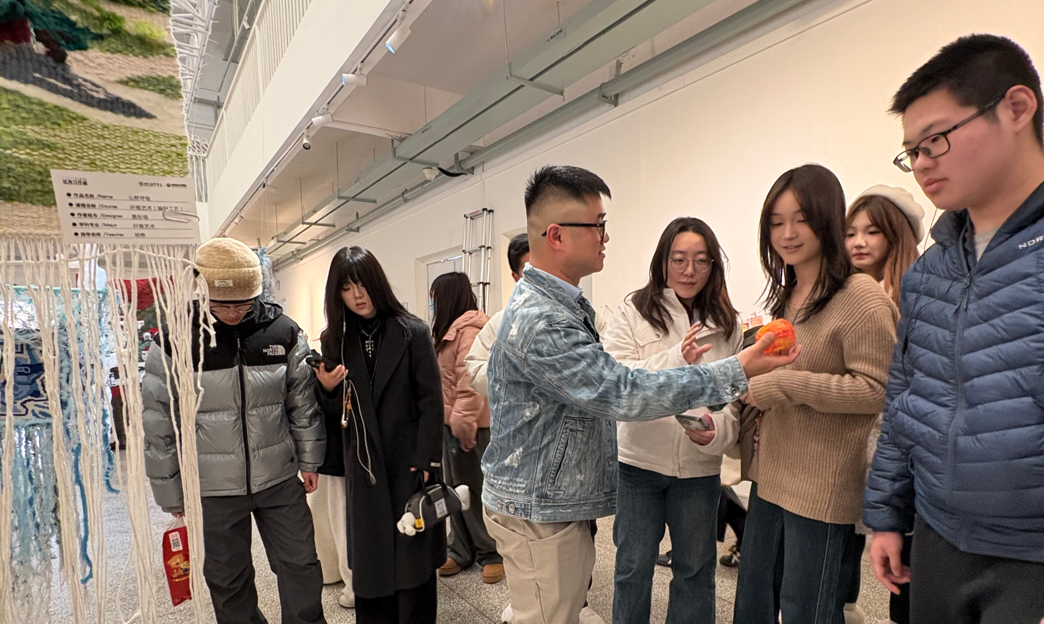 2025年12月16日下午14:00,湖北美术学院时尚艺术学院迎来了湖北经济学院国际教育学院环境设计(中外合作办学)专业的96名师生。在学院的精心安排下,来访师生依次参观了“艺术的宽度”纤维艺术展、学院学生优秀作品展及纤维专业课程展,展开了一场深入的材料感知与设计思维探索之旅。