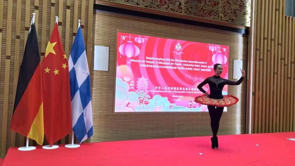 随后,当地时间2月6日,中国驻慕尼黑总领馆2026年新春招待会暨“欢乐春节——知音湖北 大美长江”主题文艺演出在中国驻慕尼黑总领馆拉开帷幕。驻慕尼黑总领事邱学军,巴伐利亚州政府办公厅主任兼巴州联邦媒体和欧洲事务部长赫尔曼,领区华人、中资机构和中国学生学者代表等400余人出席。吴鹰老师再次登台演出,以精彩多元的魔术表演充分展现了中华优秀传统文化的时代活力和深厚底蕴。次日,吴鹰老师前往慕尼黑玛利亚广场开展了一场洋溢着中国年味的快闪表演,地道的中国风吸引了当地民众驻足围观,纷纷叫好。
