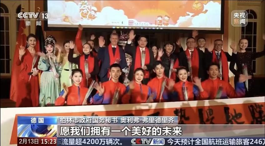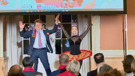 当地时间2月5日晚,由中国文化和旅游部主办,湖北省文化和旅游厅、柏林中国文化中心、柏林市政府合作举办的2026马年“欢乐春节”新春庆典晚会在柏林市政厅举行。中国驻德国大使邓洪波及夫人史玲、柏林市政府国务秘书奥利弗·弗里德里齐等300余位中外嘉宾出席活动,共庆中国农历马年新春。吴鹰老师在柏林市政厅惊艳亮相。在一片欢腾中,她现场邀请观众扬·施泰纳特共同表演,二人舞动之时,只见象征欢乐和谐的彩带凭空而出,“我完全没预料到会发生什么!”施泰纳特对新华社记者说。观众安德表示,他对魔术表演印象最深,赞其技巧精湛、互动有趣。吴鹰老师的表演将演出气氛推向高潮,赢得了在场观众的热烈欢呼。